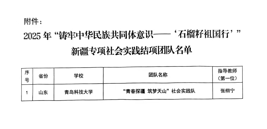 2025年暑期,由张栩宁、凯撒尔·买买提老师指导的青岛科技大学“青春探疆 筑梦天山”社会实践队(队员:于浩然、陈智宇、马热尼娜·恰依扎特、后春燕、谭昕卓(廊坊师范学院)、史岩岳、陈鹏飞、单维达、杜晓琳、恩赫、崔瑜珂、卢星星、晁毅然、阿迪力·阿卜来提、艾迪拜·艾尼娃)深入新疆多地,扎实开展实践工作,以“推普助力乡村振兴”为核心,通过推广国家通用语言文字、支教、实地调研与文化体验等形式,助力民族交往交流交融。
