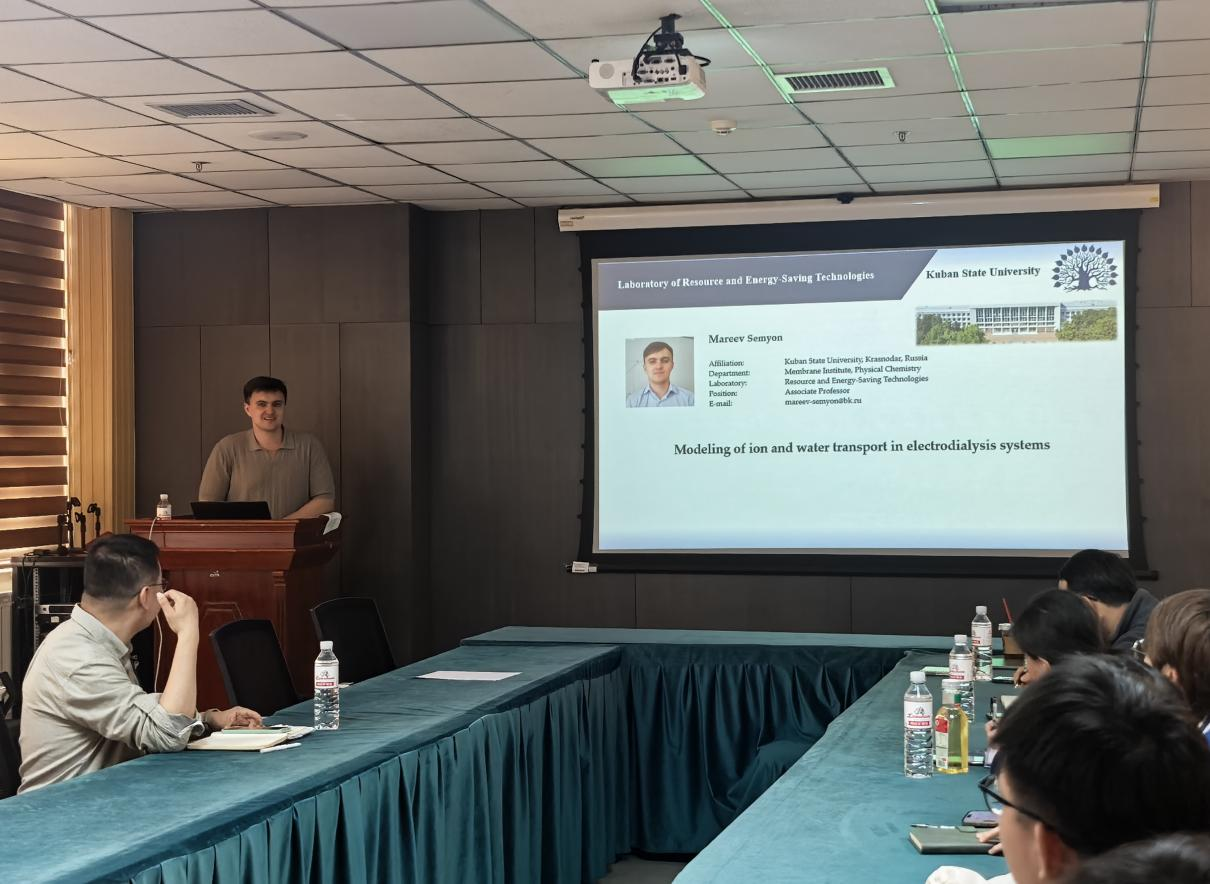 4月20日下午,俄罗斯库班国立大学 Mareev Semyon 副教授为我校师生作题为“Modeling of Ion Transport in Electrodialysis Systems: Insights into Bipolar Membranes and Polybasic Acid Solutions”的学术报告。环境与安全工程学院张杨教授主持报告会,膜技术与环境资源化团队全体成员及相关领域师生参与本次学术交流活动。