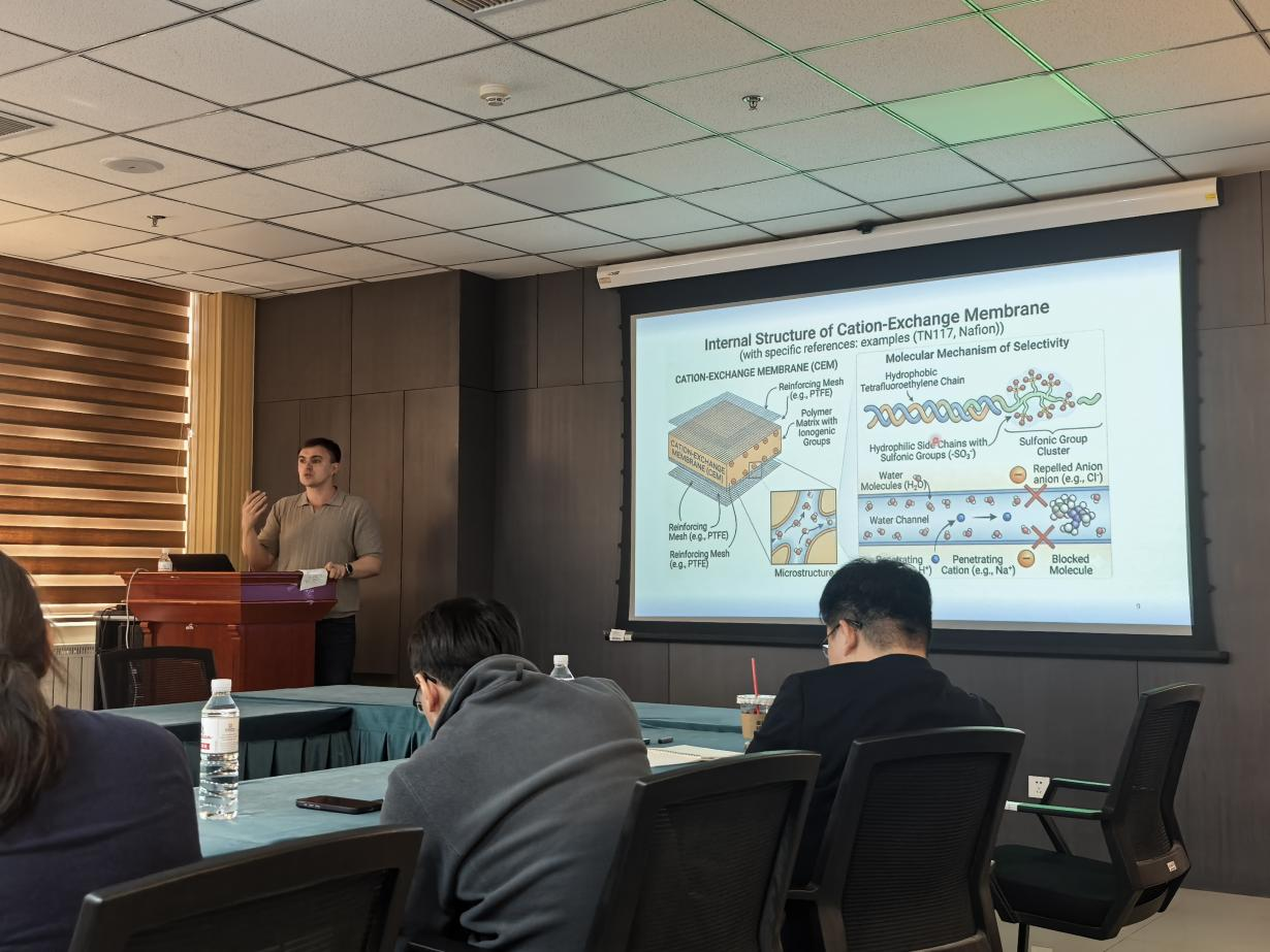 报告中,Mareev Semyon 副教授聚焦电渗析这一在海水淡化、资源回收与pH调控领域广泛应用的膜分离技术,系统分享了其团队在电渗析系统离子传输机理研究中的核心进展。他详细介绍了基于Nernst-Planck-Poisson方程并耦合局部化学动力学构建的一维数学建模框架。同时,他深入阐释了双极膜体系中固定电荷、催化剂分布及中性层对水分解效率的影响,揭示了极限电流的产生机制,还阐明了多元酸盐体系中质子转移对离子传输的调控规律与电流扫描速率对电流-电压特性的影响,为选择性电渗析优化、膜污染防控及高性能电渗析膜的设计应用提供了坚实理论支撑。