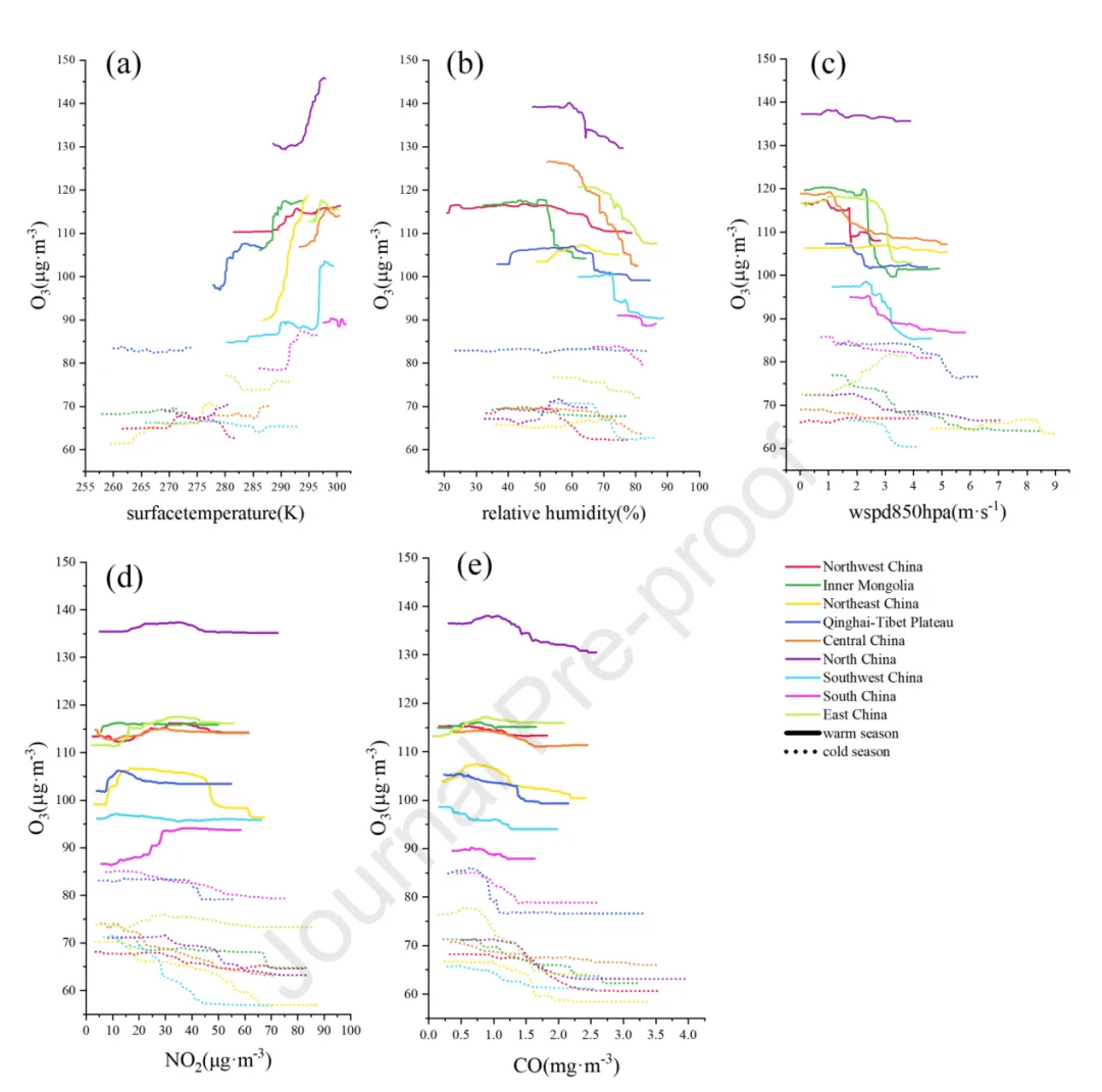 研究结合全国1497个站点的监测数据、ERA5再分析场及社会经济格网数据,引入Random Forest(随机森林)与PDP可解释机器学习方法,克服传统化学传输模型计算量大、参数依赖性强的痛点。研究证实,我国臭氧呈“南增北高”特征,暖季主要受温度、湿度与高空风速共同驱动(贡献率逾50%),而冷季对CO、NO₂的响应显著增强。该研究首次揭示了中国臭氧浓度的“高温抑制”现象及湿度关键阈值,相关成果以题为《Meteorological and Socioeconomic Impacts on China Ozone Past and Future Analysis》的研究论文,发表于Cell Press细胞出版社旗下交叉学科权威期刊《iScience》((JCR一区,IF=8.0)。青岛科技大学为第一单位,王晓红副教授为通讯作者。