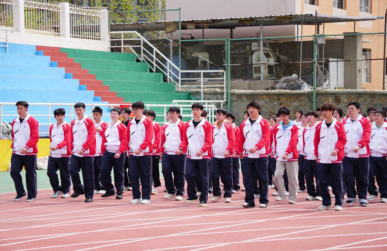 四个学生方队依次入场,大家喊着嘹亮口号、步伐铿锵,尽显青春活力。