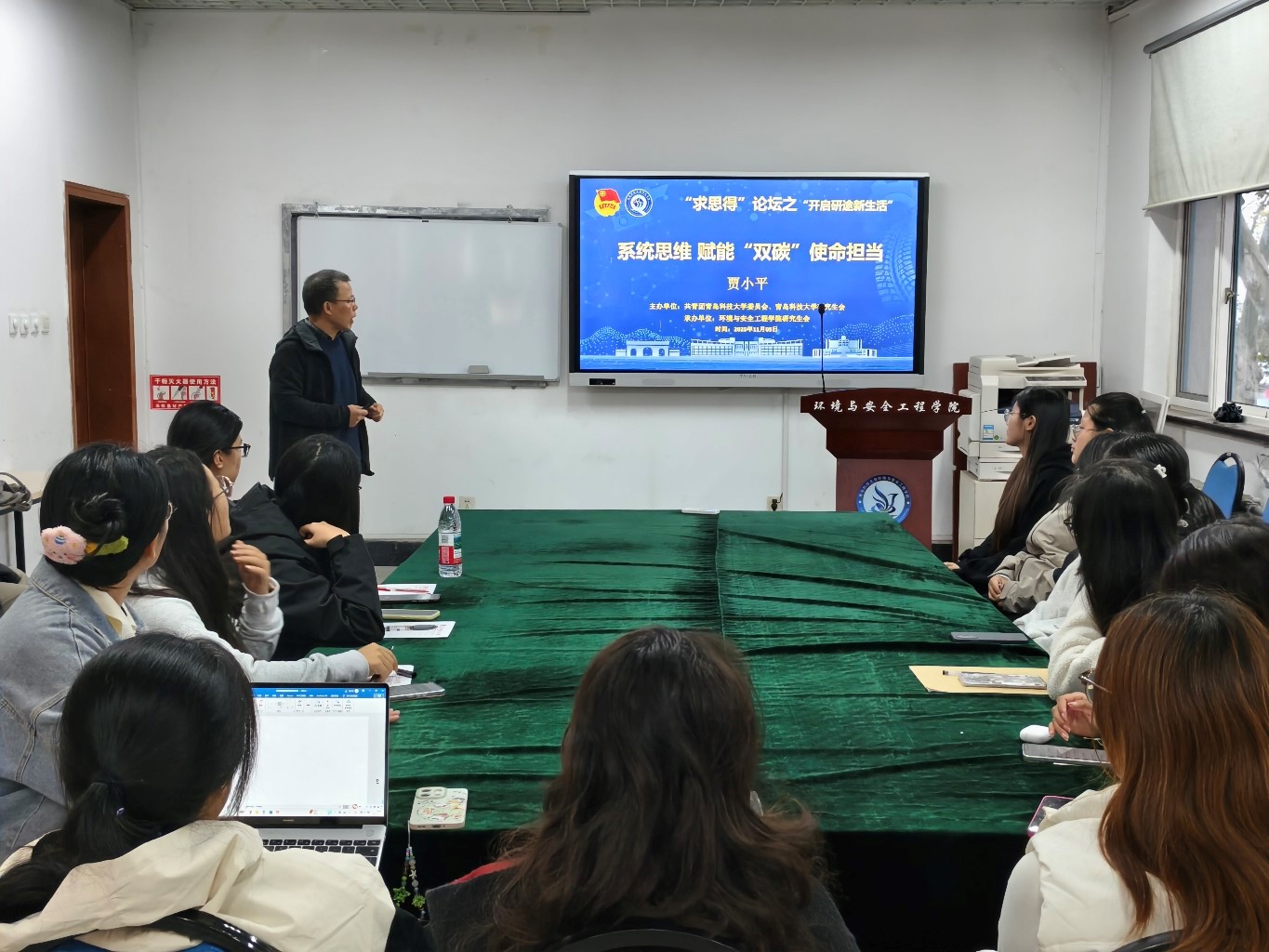 11月5日,环境学院举办“求思得”论坛之“开启研途新生活,系统思维赋能‘双碳’使命担当”专题报告会。贾小平教授作为本次论坛的主讲人,以“科研之得=有求+有思+有行动;人生之得=有求+有思+有行动”开篇,强调做学问要明事理、有思路能做事、有行动能成事的理念,从系统思维的角度,剖析了“双碳”战略的内涵与实施路径。